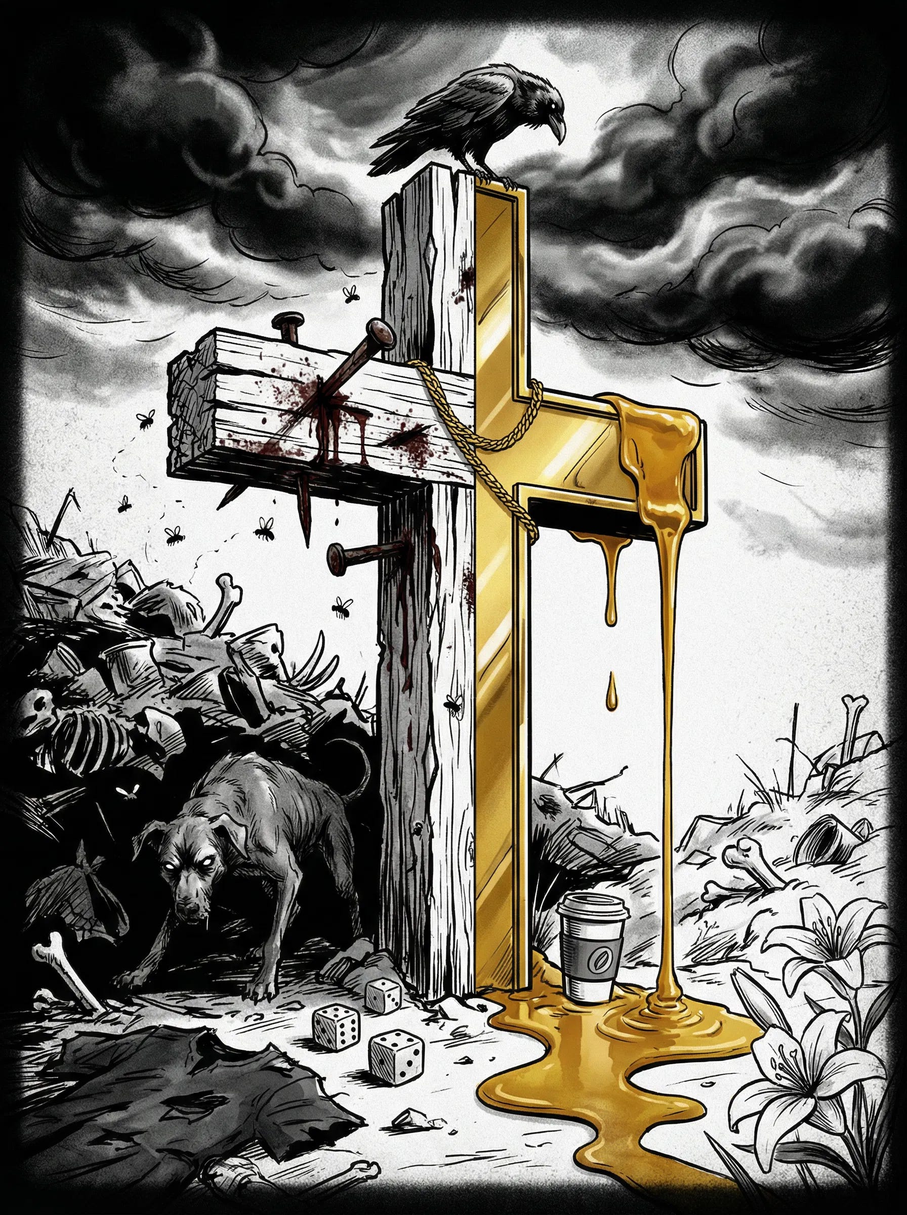 I wrote something this week, and I can’t get it out of my head. I’m calling it Crucifix Honey because that’s what western Christianity does every April. Takes the most violent act in human history and drizzles honey on it until it’s sweet enough to swallow.